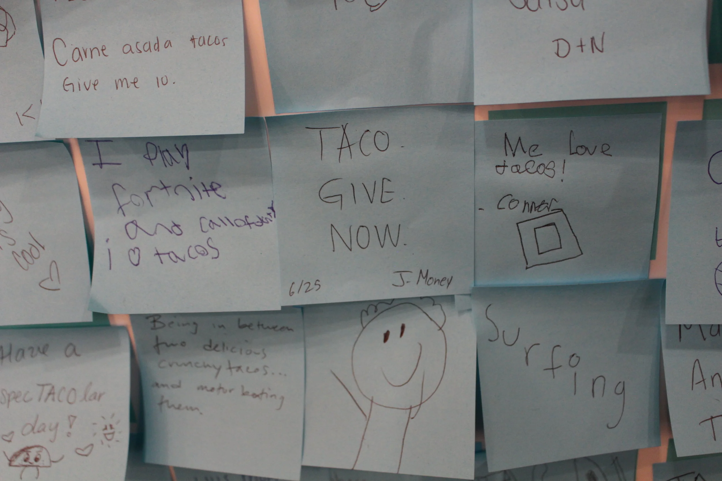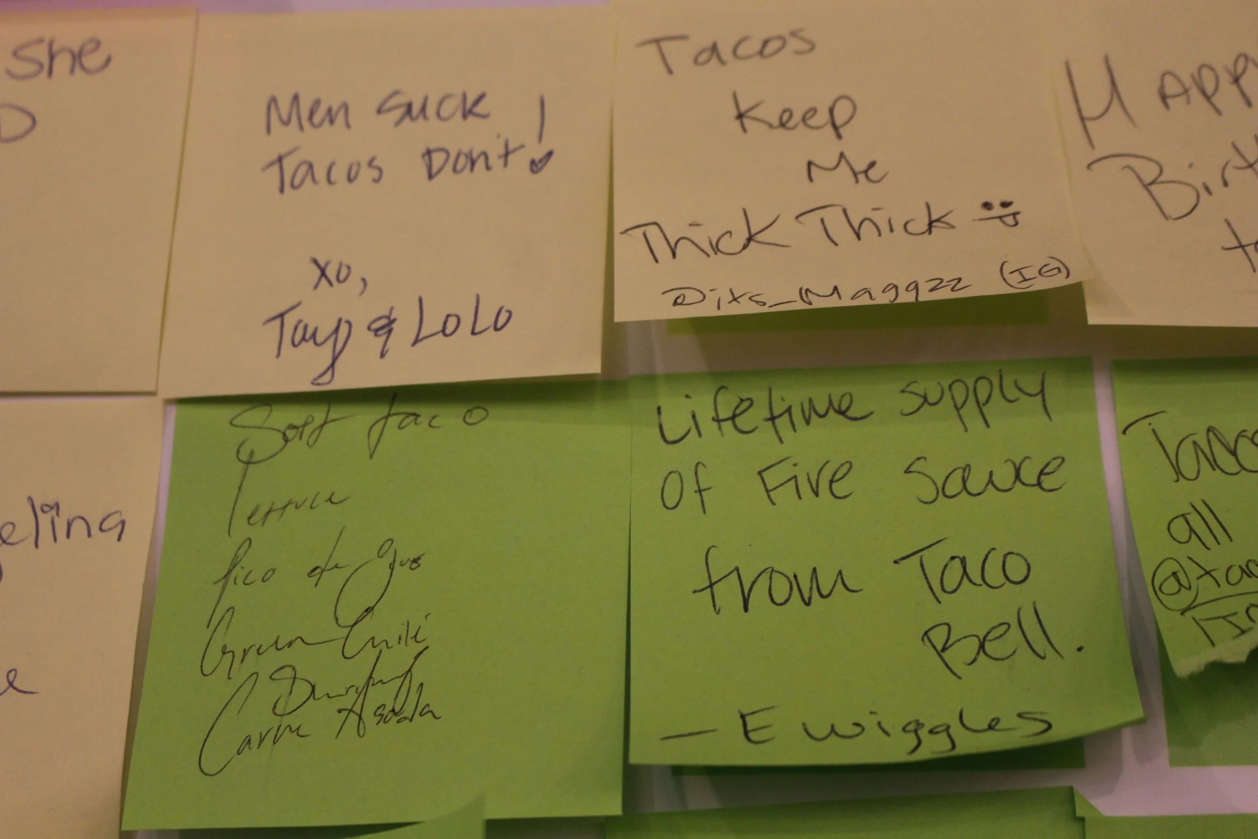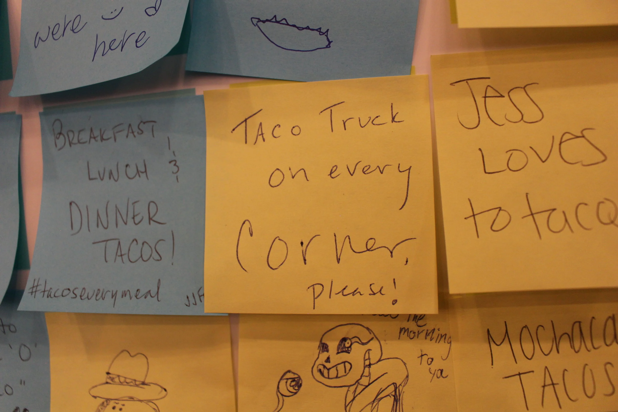 Speaking of tacos, I recently learned a lot about people’s innermost taco fantasies one afternoon on the Third Street Promenade in Santa Monica. On a whim, I decided to spring for a ticket to Tacotopia, one of those typically-annoying Instagram food museums with contrived selfie setups, and loved what was going on in the very back: a collection of visitor-generated taco dreams written on Post-Its and stuck to the wall in color-coordinated patterns that spelled out TACO. Other people were excited to be bucked off a mechanical taco and gulp down little hot sauce samples, but I spent ages blissfully photographing these Post-Its — maybe because it reminded me of a similar afternoon spent photographing graffiti written by Beatles fans on the outer walls of London’s Abbey Road Studios.
